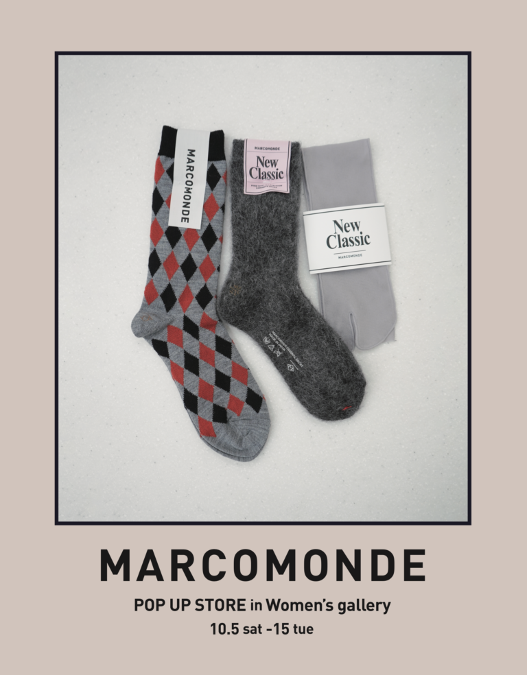 - MARCOMONDE POPUP STORE - 10.5.sat - 10.15.tue 上記期間中、Woman’s galleryにて、MARCOMONDE(マルコモンド)のPOPUPイベントを開催いたします。イベント期間中のみの限定アイテムが多数展開いたします。遊び心のあるソックスはちょっとしたギフトにもおすすめです。ぜひこの機会にお越しくださいませ。