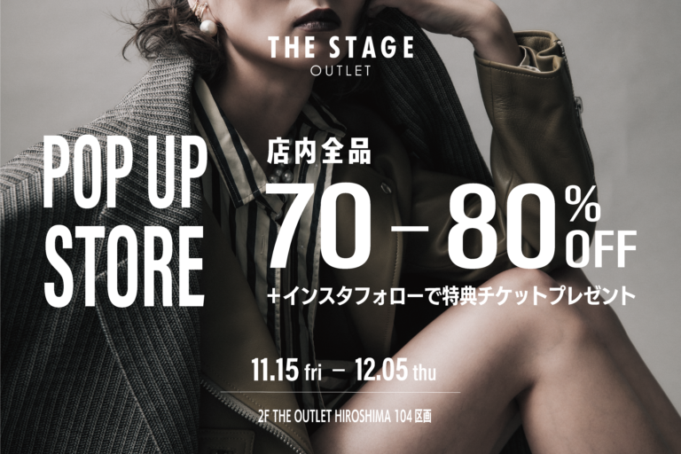 THE STAGE OUTLET POPUP STORE 11/15(金) ~ 12/5(木)@ジ・アウトレット広島 2F 104区画(ラルフローレン隣り特設会場)昨年袋町でご好評いただいた、アウトレットセールの第2弾を、今回はジ・アウトレットPOPUP会場で開催! 「店内商品全品70%OFF&一部80%OFF」先着限定のスペシャルアイテムも販売する予定! さらに11/23(土)、24(日)と11/30(土)、12/1日(日)はイオンカードのクレジット払いご利用で、 ご請求時に10%OFF!!!※AEON Payチャージ払い対象外 さらにさらに 「THE STAGE OUTLET」と「THE STAGE ONLINE」のインスタアカウントを両方フォローしていただくと、アウトレット店で使用できる特典チケットをプレゼント!(事前フォローまたは当日フォロー、どちらでもOK) この機会にぜひご来店ください。皆様のお越しをお待ちしております。 THE STAGE OUTLET Instagramはこちらから↓@the_stage_outlet 取り扱いブランド N°21 ERDEM PUCCI BLAMINK Acne Studios MM⑥ TOTEME MAISON KITSUNE See By Chloe sacai Off-White Golden Goose Ron Herman THE SHINZONE beautiful people PLAN C NINA RICCI TELA 3.1 Phillip Lim Stella McCartney rag & bone Victoria Beckham LEMAIRE MSGM CYCLAS UNION LAUNCH