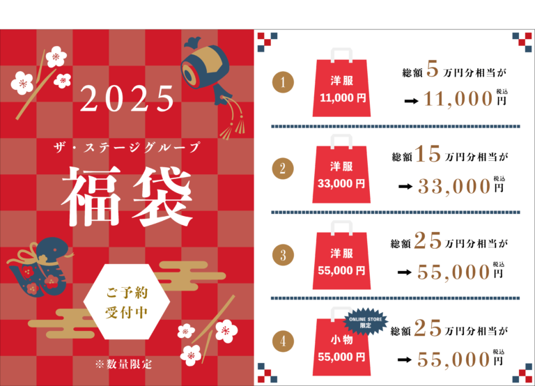 2025 福袋 - ご予約受付中 - 12月18日(水)より全店舗にて先行予約受付スタート! 今年も店頭およびONLINE STOREにてお得な福袋を販売いたします。 ラインナップは洋服 :250,000円分相当 → ¥55,000(税込) 150,000円分相当 → ¥33,000(税込) 50,000円分相当 → ¥11,000(税込)小物: 250,000円分相当 → ¥55,000(税込)の4種類をご用意。 ONLINE STOREでは12/27(水)までのご予約分 年内発送12/28(木)以降のご予約分 1/3(水)より発送いたします。 ▼ONLINE STOREでのご予約はこちらから福袋販売会場 また店頭では年始営業日より販売いたします。【年始営業日】THE STAGE OUTLET1/1 元旦 9:00〜the stage WOMAN’S GALLERY GALLEY1/3 (水) 10:00〜 数に限りがございますのでぜひお早めにご予約ください! 【 注意事項 】■数量限定の商品です。在庫がなくなり次第、販売を終了します。■お届けする製品のブランドやアイテムをお選びいただくことはできません。■福袋の特性上、返品・キャンセルは一切致しかねます。