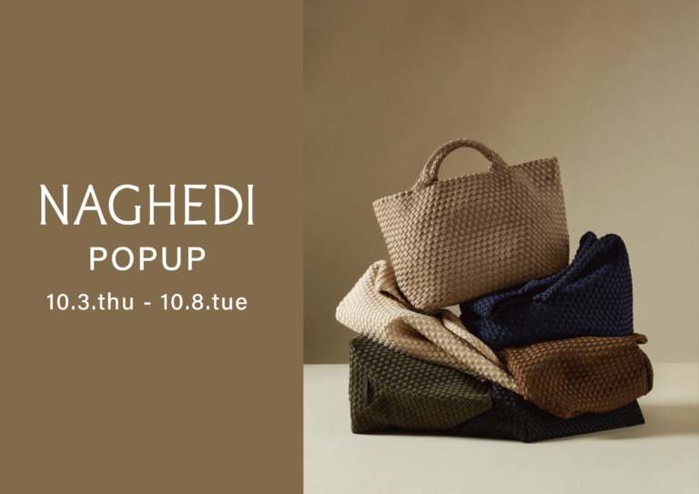 - NAGHEDI POPUP STORE - 10.3.thu - 10.8. tue 上記期間中、GALLRYにてNAGHEDI(ナゲディ)のPOPUPイベントを開催いたします。一つ一つ手織りで作られているNAGHEDIのバッグは、ベーシックでシンプルなデザインかつ機能性も兼ね備えたバッグです。ぜひこの機会に手に取ってご覧ください。 NAGHEDI 20年近くアクセサリー業界に身を置くサラ・ナゲディが、”シーズンを超越できるクラシックなバッグを作りたい”という願いからスタートさせたブランド。長持ちし、お手入れが簡単なネオプレン素材を巻いて織る独自の製法によって、軽量で汚れにくく、防水性にも優れたバッグを展開している。